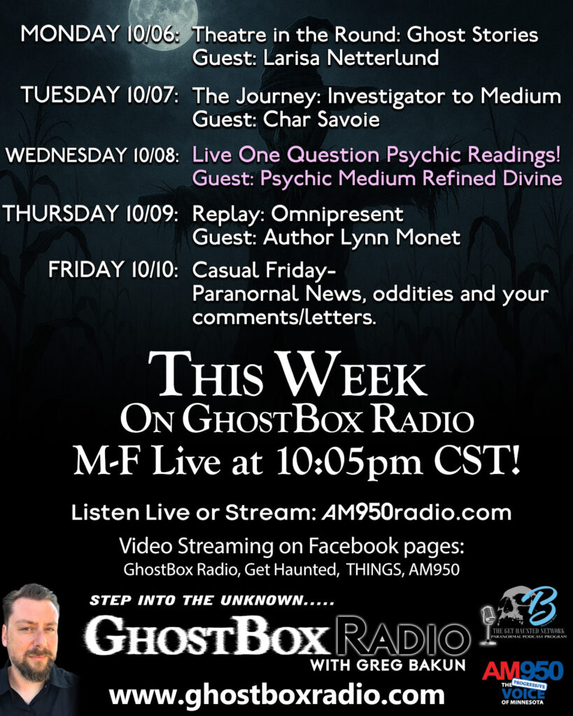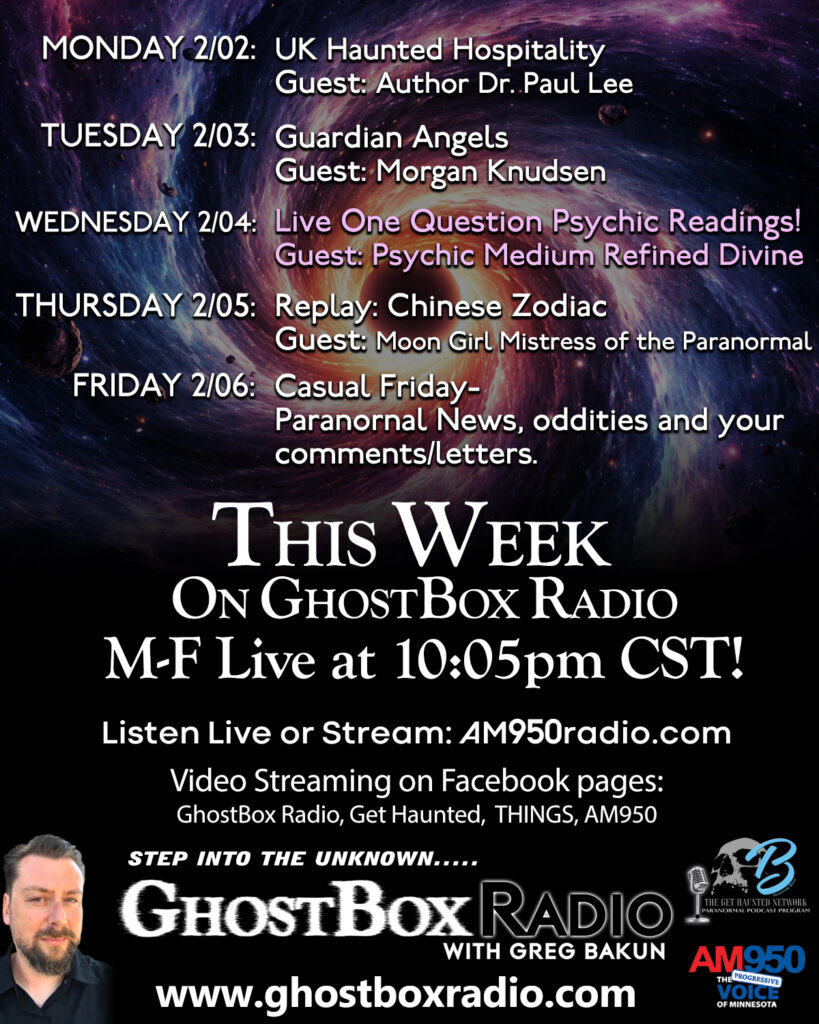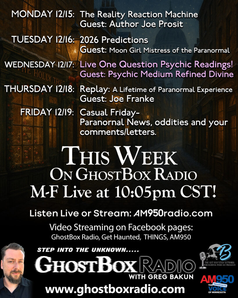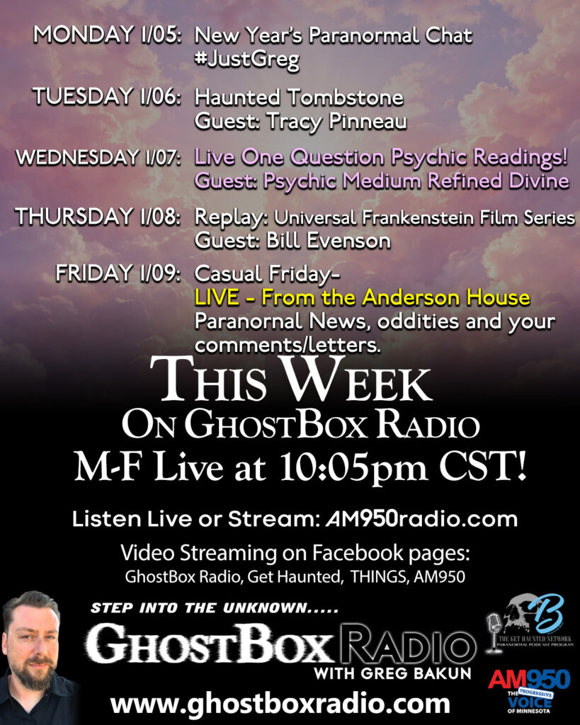 Welcome to GhostBox Radio with Greg Bakun. Broadcasting LIVE Monday-Friday on AM950 Radio in the Twin Cities at 10:05 pm CST you can listen to the show live everywhere streaming on AM950 Radio website or watching the video feed on GhostBox Radio with Greg Bakun Facebook Page. Every night we talk about the Paranormal, Ufology, Bigfoot or just the unusual or interesting. On this page, you can check out past episodes, current events you can take part in or news about what’s going on. If you have any guest or topic requests, questions or general feedback please reach out to us at comment@ghostboxradio.com